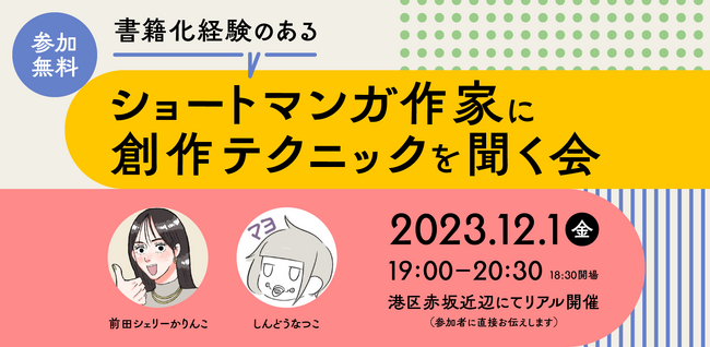 「書籍化経験のあるショートマンガ作家に創作テクニックを聞く会」は、衝撃の実話を元にマンガを描かれている、『メンヘラ製造機だった私が鼻にフォークを刺された話』の著者・前田シェリーかりんこさん、『3度目の浮気~ゴミカス旦那よ、覚悟しろ~』の著者・しんどうなつこさんをお招きし、「どんな道筋で書籍化に至ったのか?」「日々どのように家庭と創作を両立しているのか?」など、普段SNSには投稿できないような生々しいお話をお聞きするリアルトークイベントです。