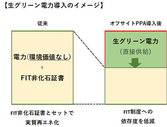 今回切替えする施設は、これまで、多くは東急不動産の再エネ発電所由来のFIT非化石証書を購入する手法で、再エネ電力を利用していました。オフサイトPPA導入後は、FIT非化石証書だけでなく、使用電力量の一部について東急不動産が保有・開発する発電所から『生グリーン電力』を直接供給することになります。