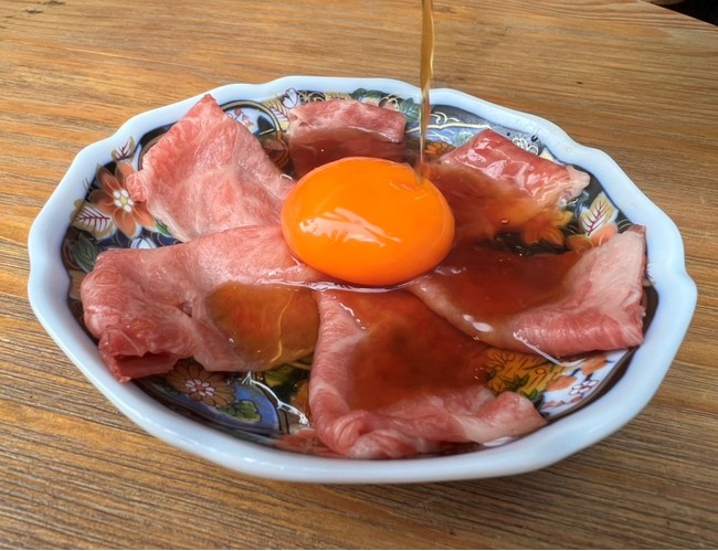 <こだわり>低温調理で火入れした黒毛和牛は口に入れた瞬間”とろける”ほど柔らかく甘みがあります。絶妙な卵は茨木県奥久慈のブランド卵を使用。鰹と昆布の温かい特製和出汁をかけてお召し上がりください。