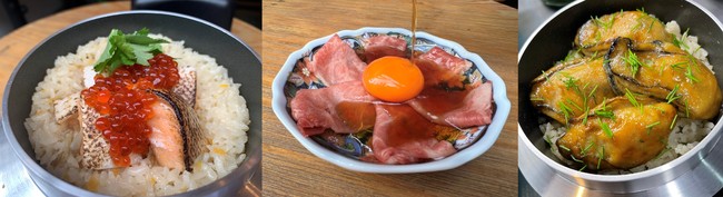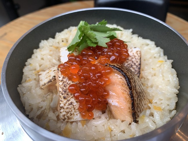 <こだわり>お店で引いた特製出汁を使用し、オーダーが入ってから25分じっくりと炊き上げることで、お米の甘みを最大限に引き出します。牡蠣釜めしは、大ぶりの兵庫県赤穂市牡蠣を使用。男女問わず人気の鮭いくらは定番商品として通年販売。季節の釜めしは、旬の鯛と筍の釜めしををご用意。食材の旨みが浸み込んだ自慢の逸品です。