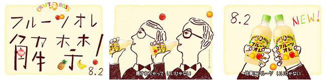 またお笑い芸人「シソンヌ」を起用した「クラフトボス フルーツオレイラストコント」を、CRAFT BOSS公式Twitter上で、7月26日(火)より7日間連続で公開します。イラストコントでは「シソンヌ」のお二人がシチュエーションに合わせて七変化。さまざまな場面でフルーツオレに合わせたコントの掛け合いを披露します。
