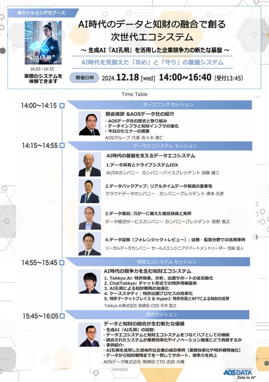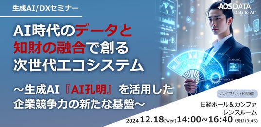 企業データとAIの利活用カンパニー、AOSデータ株式会社 (本社:東京都港区、代表取締役社長 佐々木 隆仁 以下 AOS データ社)は、2024年12月18日(水)に「生成AI『AI孔明』を核としたデータエコシステムと知財エコシステムの融合プラットフォーム」をテーマとしたセミナーを開催いたします。