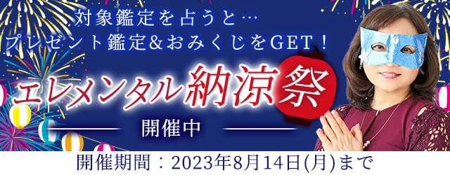 『エレメンタル納涼祭キャンペーン』は、サイト内で納涼祭を楽しめるキャンペーンとなっております。対象鑑定をご購入いただくと、おみくじを水にひたすと文字が浮かび上がる「水みくじ」をキャンペーン期間中いつでもお楽しみいただけます。さらに、期間限定の占いもプレゼント致します。この機会にぜひ「水晶玉子◆エレメンタル占星術」で占いをお楽しみ下さい!
