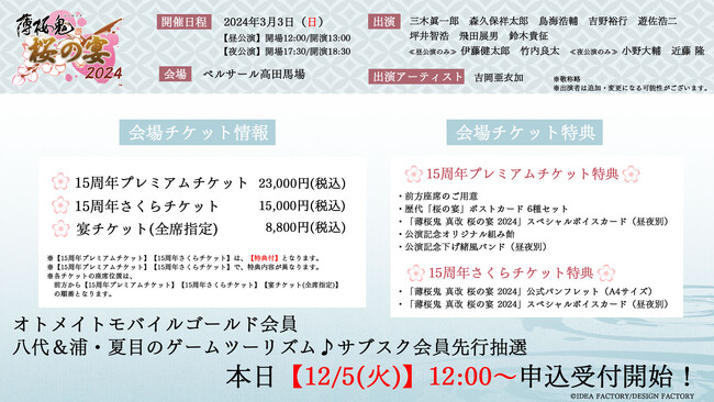アイディアファクトリー株式会社の女性向けゲームブランド「オトメイト」は、2024年3月3日(日)にベルサール高田馬場にて開催する「薄桜鬼 真改 桜の宴 2024」の「オトメイトモバイルゴールド会員先行抽選/八代&浦・夏目のゲームツーリズム♪サブスク会員先行抽選」チケット申込受付を、本日12月5日(火)12時から開始いたしました。