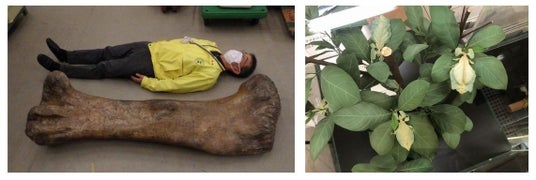 左:「アパトサウルス」の大腿骨と人 イメージ 右:“擬態の名人”「コノハムシ」 イメージ