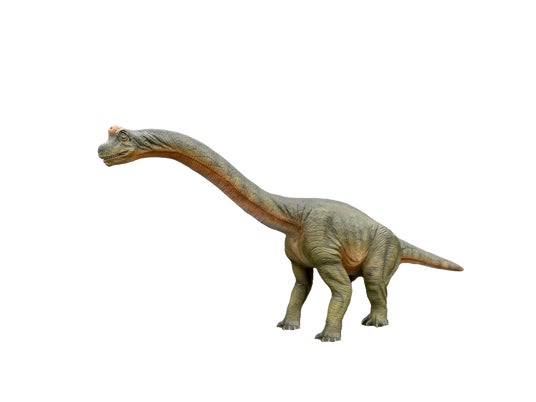 ブラキオサウルスは長い首と前足が特徴の、キリンのような見た目の草食恐竜です。ギリシャ語で「腕が長いトカゲ」という意味だそう。この長い前足を生かして、高いところにある葉や枝を食べて暮らしていたようです。