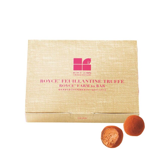 チョコレートにヘーゼルプラリネを合わせたジャンドゥーヤに、さくさくとした食感のフィアンティーヌを混ぜ、洋酒がほんのり香る生チョコレートでコーティング。仕上げにココアパウダーをまぶしました。フルーティな味わいのロイズファームトゥーバーのチョコレートを使用しています。