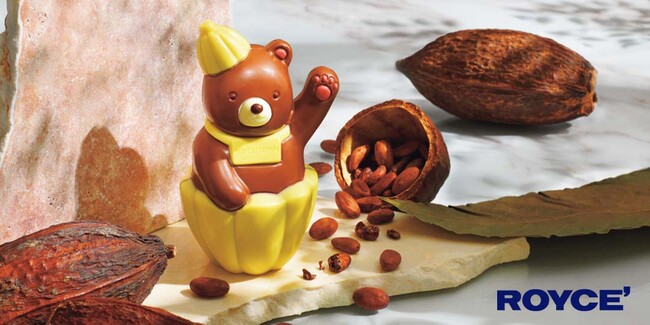 ロイズタウン工場に併設する体験型施設「ロイズカカオ&チョコレートタウン」のキャラクターを、中が空洞の”ホローチョコレート”にしました。カカオポッド(カカオの実)に入った可愛いクマのチョコレートをお土産にどうぞ。