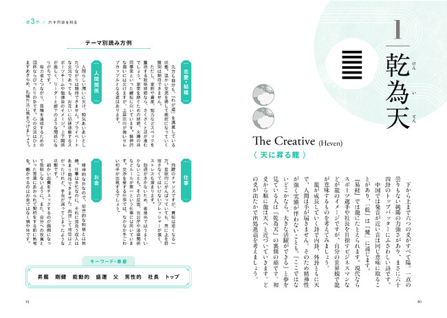 64卦のページでは、恋愛・結婚、仕事、人間関係、お金のカテゴリーごとに解説することで、占い結果として解釈しやすく、また占断のコツとしても活用できます。