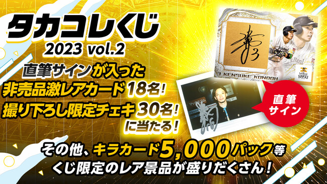 タカコレカード販売を記念して、スマホ・PCから簡単に購入できるオンラインくじ「タカコレくじ」を開催いたします。福岡ソフトバンクホークス選手の直筆サインが入った非売品カードは合計18名様に、同じく選手の直筆サイン入り撮り下ろしチェキは30名様に当たります。そして店頭の販売パックの中には存在しない非売品のキラカードパックをなんと5,000パックご用意いたしました。