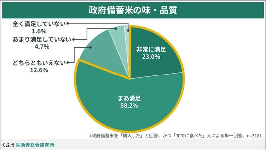 購入した政府備蓄米は「まだ食べていない」と回答した人が42.0%を占めました。すでに食べた人を対象に味や品質についてたずねたところ、「非常に満足」(23.0%)、「まあ満足」(58.2%)を合わせた約8割が満足していることがわかりました。