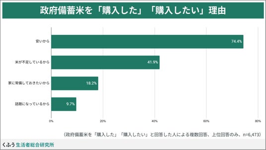 政府備蓄米を「購入した」「購入したい」と回答した人からは、「安いから」(74.4%)という理由が圧倒的に多く挙がりました。