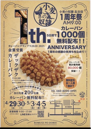 株式会社こむぎの(本社:北海道広尾郡大樹町、代表:橋本 玄樹)が展開する【小麦の奴隷】は、オンラインサロンHIU(堀江貴文イノベーション大学校)に集まったメンバーのコミュニティから堀江氏の声かけによって生まれた「地方活性型エンタメパン屋」です。この度、2021年4月30日に沖縄県北谷町に開業した【小麦の奴隷 沖縄北谷店】が1周年を迎えます。同店では1周年祭として、対象期間中、名物「ザックザクカレーパン」を合計1000個、無料配布します。