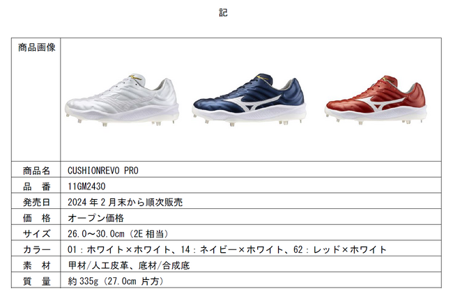ミズノは、ミズノ初の野球用厚底ソールを搭載した野球スパイク「CUSHIONREVO PRO(クッションレボプロ)」をミズノ直営店4店舗※1、ミズノ公式オンライン、一部のミズノ野球品取扱店で2024年2月末から順次販売します。