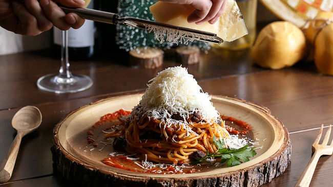 肉の旨味が凝縮された自慢のボロネーゼの上にイタリア伝統のハードチーズ「ベラ・ロディ」をこれでもかというほどかけ続けます。ゴツゴツしたボロネーゼ山の岩肌を覆うふわふわの粉雪チーズの絶景は必見です。