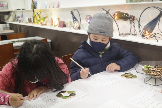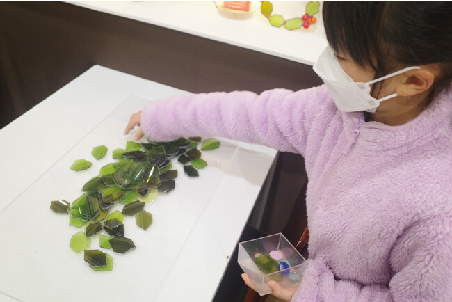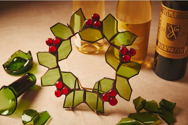 点灯式当日、小学生はワインボトルを使ったクリスマスリース作りに挑戦しました。パーツとして使うのは、ピーマン通りに並ぶワインボトルツリーとして使用しているうちに、ヒビが入り使えなくなったワインボトルです。小学生たちはワインボトルのかけらを組み合わせながら、思い思いにクリスマスリースを形にしました。3年生の参加者からは「思い出のリースができた。ワインボトルがリースに生まれ変わるなら、捨てないで生まれ変わらせられるものが他にもいっぱいありそうだと思いました。」と感想を語り、アップサイクルに親しみました。