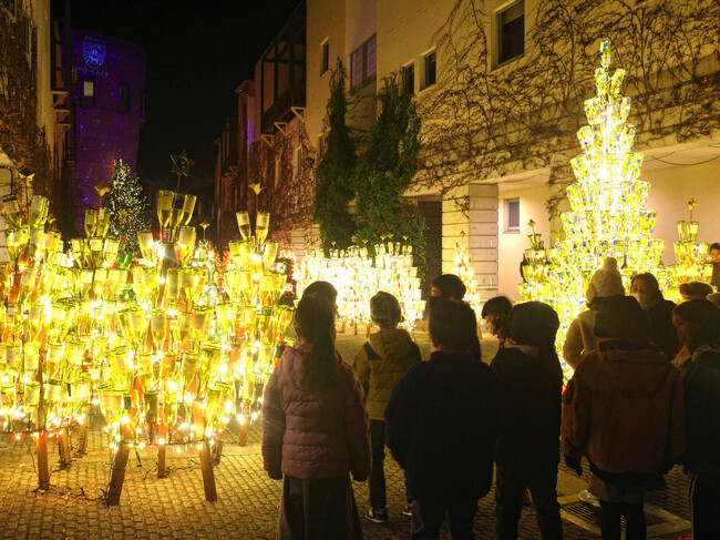 自然豊かな八ヶ岳エリアのリゾートホテル「星野リゾート リゾナーレ八ヶ岳」では、2023年11月30日に1万2千本のワインボトルが輝く「ワインリゾートクリスマス2023」の点灯式を実施しました。今年は「アップサイクル(*1)」でクリスマスを楽しむというテーマにちなみ、授業でSDGsやアップサイクルについて学んだ地元の小学生と一緒にクリスマスイベントの開始を祝いました。ワインリゾートクリスマス2023」は、ワインボトルをアップサイクルしたワインボトルツリーやクリスマスにちなんだクラフト体験、ワインボトルを器に使用したクリスマス限定のパフェなど、大切な人とひと味違う特別なクリスマスを過ごせるイベントです。点灯式当日には、楽しみながらアップサイクルに親しんでほしいという思いから、ワインボトルを使ったクラフト体験を開催し、小学生は楽しみながらアップサイクルについて理解を深めました。