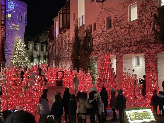 点灯式はワインボトルツリーが並ぶホテルのメインストリート「ピーマン通り」で実施しました。今年は「アップサイクル」でクリスマスを楽しむというテーマにちなみ、点灯者は授業でSDGsやアップサイクルについて学んだ地元の小学校の2,3,4年生の13名が務めました。施設内のレストランや近隣のワイナリーから集めたワインボトルをツリーの土台に差し、ワインボトルツリーが完成。小学生のカウントダウンを合図に、「赤ワイン」をテーマにピーマン通りのタワーに映し出された映像と連動して1万2千本のワインボトルを使用したワインボトルツリーが点灯し、参加者からは歓声が沸き上がりました。