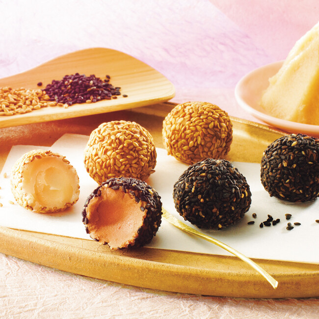西京味噌とホワイトチョコレートを練り込んだ白あんを丸め、仕上げにごまをまぶしました。[金ごま]と[黒ごま]の2種類の味わいのセットです。[金ごま]は京都で丁寧に焙煎した炒り金ごまを使用し、[黒ごま]は香ばしい黒ゴマを使用して、あんにはまろやかな味わいのチョコレートも加えています。それぞれの風味の違いもお楽しみいただけるひと箱です。