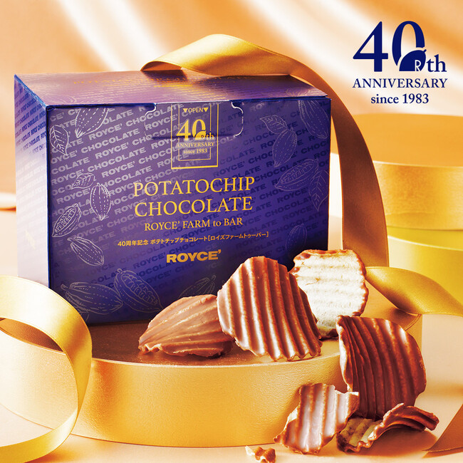 フルーティな味わいが魅力の自社農園産のカカオでつくったチョコレートを、ポテトチップの片面にコーティング。チョコレートは、ミルクチョコレートとビタータイプのチョコレートの2種類を合わせ、甘さとカカオ感のあるバランスのとれた味わいに。創業40周年を記念した今だけの特別なパッケージです。