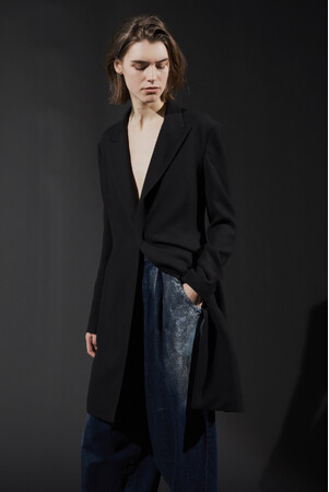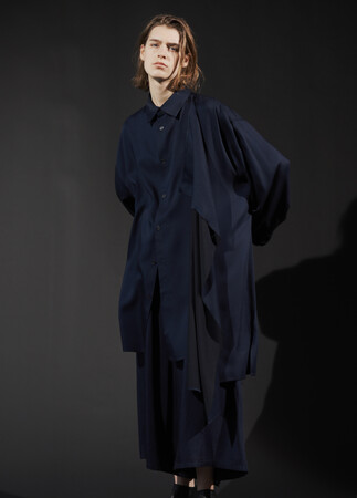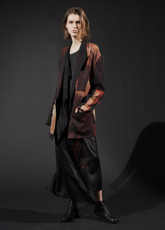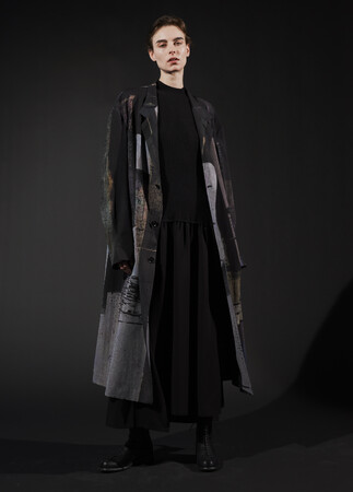 手法としてはトロンプルイユのような、ヴィンテージのスカーフ柄や古着の生地を柄としてパッチワークのように配するプリントは、奥行きの見える柄の配置や、不思議な表現で、視覚と風合いの構成が、複雑な雰囲気をつくる。印象的な柄の生地をたっぷり使用したロングテーラードコートを、シンプルに羽織る強いスタイル。
