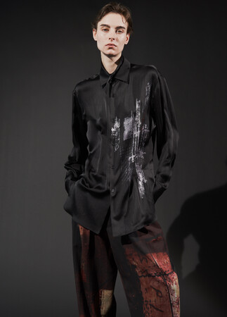 古布が写し取られ部分的に表出したように配されたシルクシャツ。たおやかで柔らかな光沢と質感。パッチワークのように、ヴィンテージのスカーフ柄や古着の生地の構成をプリントで表現。奥行きの見える柄の配置、視覚と風合いの構成が、複雑で不思議な雰囲気をつくりだす。上品なプリントレイヤードの提案。