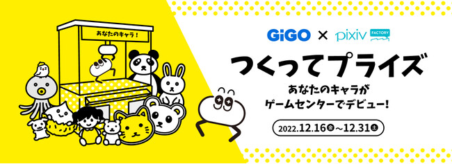株式会社GENDA GiGO Entertainment(本社:東京都港区 代表取締役社長:上野 聖 以下当社)は、ピクシブ株式会社(本社:東京都渋谷区 代表取締役:國枝信吾)が運営するグッズ制作サービス「pixivFACTORY」と、自分の描いたイラストがクレーンゲームの景品になる企画「つくってプライズ あなたのキャラがゲームセンターでデビュー!」を2022年12月16日(金)から12月31日(土)まで開催します。