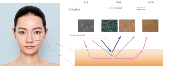 多彩な光源での高感度カメラによる撮影で、肌の表面から内部までの多様な情報を取得。