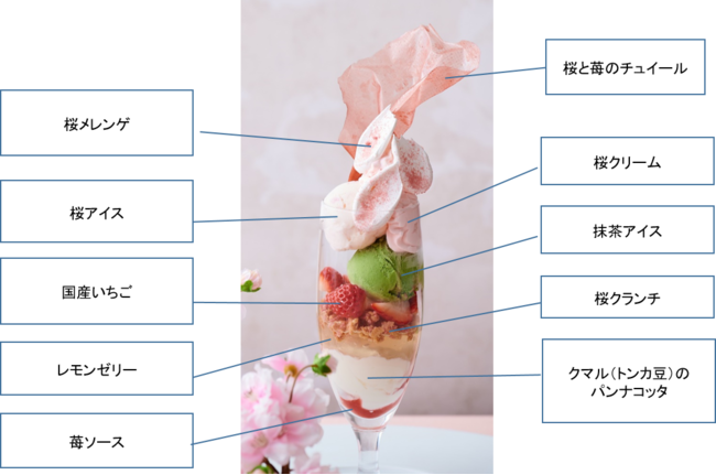 桜と相性の良い抹茶と苺の他に、桜の葉のような甘く上品な香りが漂うスパイス「クマル」(トンカ豆)のパンナコッタを重ねることで味わいに深みを持たせました。