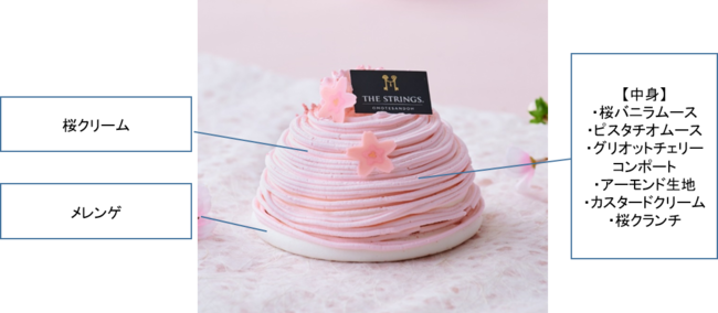 メレンゲとクリームの間の桜クランチと、程よい酸味のグリオットチェリー使用することで味と食感にアクセントを加えました。