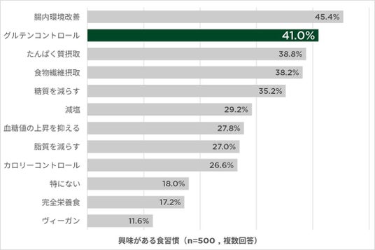 「興味がある食習慣」を聞いたところ、最も回答が多かったものは腸内環境の改善で45.4%、次いでグルテンコントロール41.0%、たんぱく質の摂取 38.8%、食物繊維の摂取38.2%、糖質制限35.2%。腸活やたんぱく質の摂取のような定番の食習慣と同等にグルテンを控える食生活の関心の高さがうかがえる。