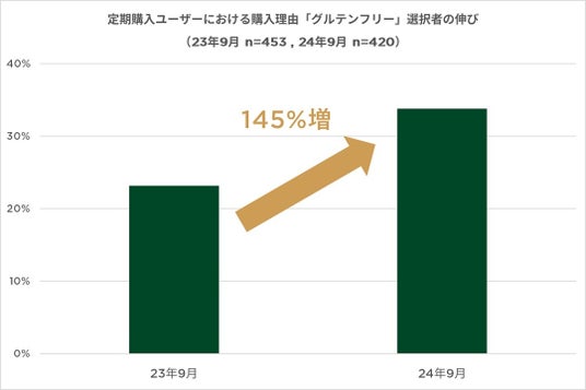 また、上記のような背景を受け、ZENB商品の定期購入ユーザーに対して購入理由を聞いたところ、約3人に1人が「グルテンフリーだから」という最多の回答結果となり、1年前と比較してグルテンを控えようとする意識の高まりがうかがえる。