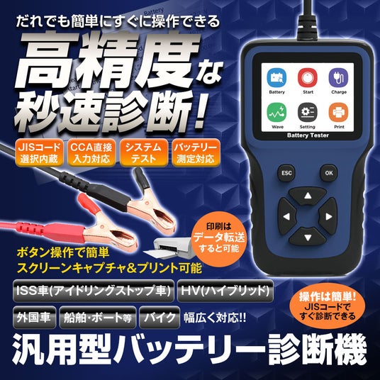 多数のデータ分析を約3秒で検査ができます!さらにプリント機能も搭載した持ち運びに便利で使用も簡単な汎用型12Vバッテリー診断機です。