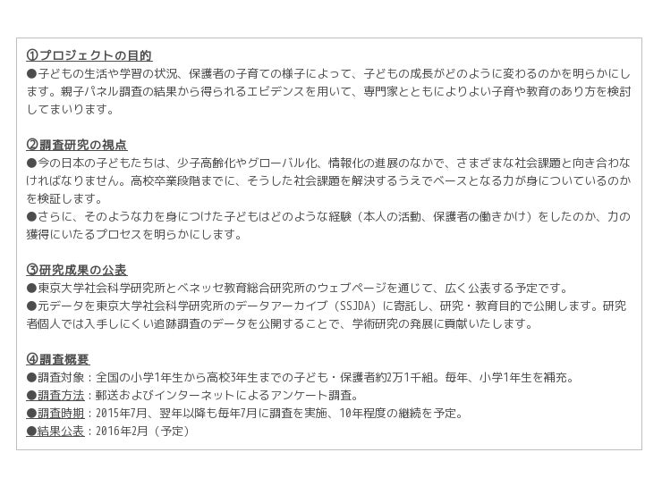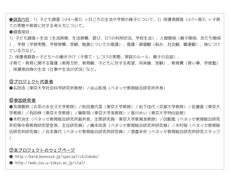 東京大学社会科学研究所と株式会社ベネッセホールディングス(本社:岡山市)の社内シンクタンク「ベネッセ教育総合研究所」は、「子どもの生活と学び」の実態を明らかにする共同研究プロジェクトを2014年1月に立ち上げました。このプロジェクトは、小学1年生から高校3年生までの親子約2万1千組に対して10年程度の長期にわたる追跡調査(親子パネル調査※)を行い、その結果から、子どもの生活や学習の状況、保護者の子育ての様子によって、子どもの成長がどのように変わるのかを明らかにするものです。このような初等中等教育段階の親子の大型パネル調査は、国内では類を見ないものであり、子育てや教育のあり方を考えるうえでの貴重なデータを入手することができます。