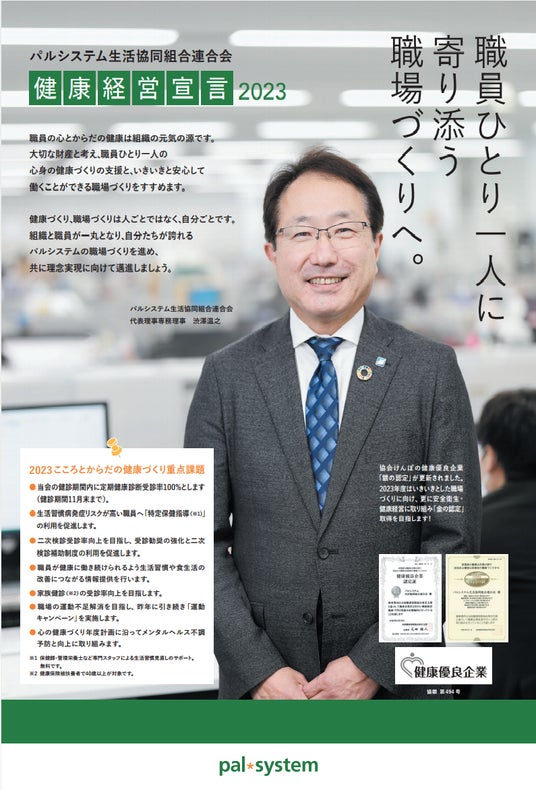 パルシステム連合会は2023年度、「働く人たちの心と体の健康は組織の財産である」との考えのもと「健康経営宣言」を発表し、健康づくり重点課題7項目を推進してきました。これらの取り組みが認められ、健康優良企業「銀の認定」が更新されました。今後も段階を進め「金の認定」取得をめざし、職員の健康づくりに取り組みます。