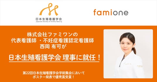 「子どもを願うすべての人によりそい 幸せな人生を歩める社会をつくる」をビジョンに掲げ、法人の従業員向け福利厚生や自治体の住民向け支援を行うヘルスケアサポートサービス「ファミワン」 https://famione.com/benefit/などを展開する株式会社ファミワン(本社:東京都渋谷区、代表取締役:石川勇介、以下当社)の代表看護師・不妊症看護認定看護師の西岡 有可が、日本生殖看護学会の理事に就任いたしました。理事長には、武蔵野大学看護学部 教授 坂上 明子氏が就任されました。