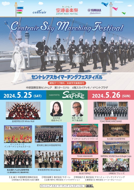 中部国際空港株式会社(所在:愛知県常滑市、代表:犬塚力)は、2024年5月25日(土)・26日(日)の2日間、マーチングをテーマにした音楽イベント「CENTRAIR SKY MARCHING FESTIVAL 2024」を開催します。