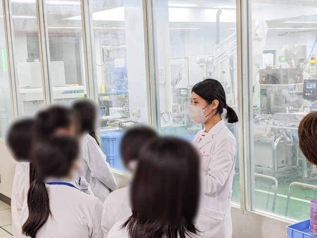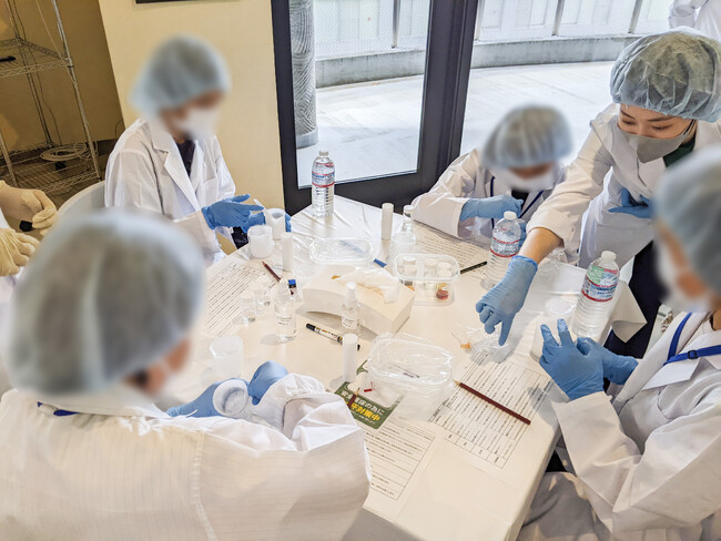 当日は工場でものづくりをするということにフォーカスし、実際に白衣を着用して、スタッフと一緒にハンドクリーム作りを体験。クリームが入る前のチューブ容器の形状や、いままでみたこともない機械を見て驚いた様子でした。保護者の皆さんからは、「社会へ出るまえに、このような体験を通じて業界を知れるチャンスはとても良い経験になる」と好評で、大人の皆さんにとっても興味深い時間となったようです。