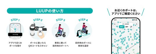 ・詳細:スマートフォンアプリ「LUUP」を用いて、電動キックボードや電動アシスト自転車に乗車し、街じゅうにあるポートからポートへの移動ができます。