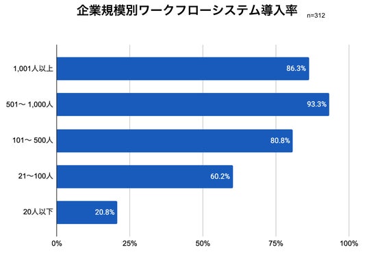 稟議のワークフローシステムを導入している企業について、企業規模ごとに並び替えたところ、最も多かったのは「501~1,000人の企業」が93.3%、次いで「1,001人以上の企業」が86.3%、「101~500人の企業」が80.8%となりました。