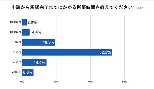 「申請から承認完了までにかかる所要時間」を尋ねたところ、最も多かったのは「2~3日」が52.5%、次いで「1日以内」が19.3%、「4~5日」が14.4%となりました。その中で、「1日以内に終わる」の割合が26.5%、「1日以上かかる」の割合が73.5%となっています。