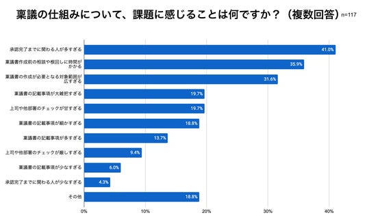具体的な課題を複数回答で尋ねたところ、「承認完了までに関わる人が多すぎる」が最多の41.0%でした。また、「稟議書作成前の相談や根回しに時間がかかる」が35.9%、「稟議書の作成が必要となる対象範囲が広すぎる」が31.6%と続きました。