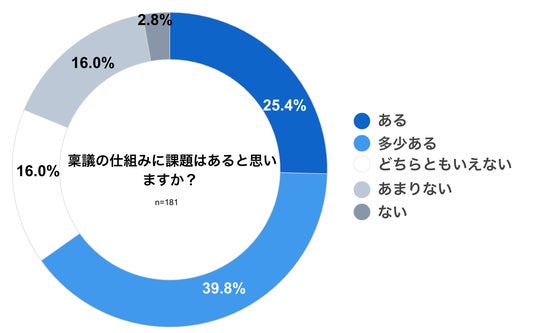 「所属組織の稟議の仕組みについて課題があると思うか」と尋ねたところ、「ある」「多少ある」を選んだ回答者は65.2%となりました。また、「ない」「あまりない」を選んだ回答者は18.8%となっています。