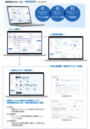 BIZSHIPで提供している財務領域の経営課題解決を図る「経営診断」と、このたび開発した非財務領域の「経営カテゴリー診断」を組み合わせることで、FFGのお客さまの多様化する経営課題を見える化し、財務と非財務領域の両面から、お客さまの事業成長へ向けたさまざまなサポートが可能になります。
