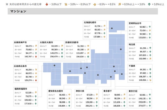 ●マンションは、ファミリー向きが6カ月連続して全13エリアで前年同月を上回る。中でも、神奈川県・仙台市・京都市・大阪市・神戸市・福岡市の6エリアは2015年1月以降最高値を更新。
