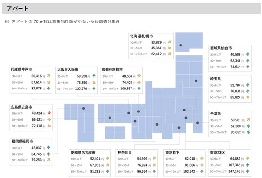 ・コメントでは、30平方メートル 以下を「シングル向き」、30平方メートル ~50平方メートル 以下を「カップル向き」、50平方メートル ~70平方メートル 以下を「ファミリー向き」、70平方メートル 超を「大型ファミリー向き」としています。