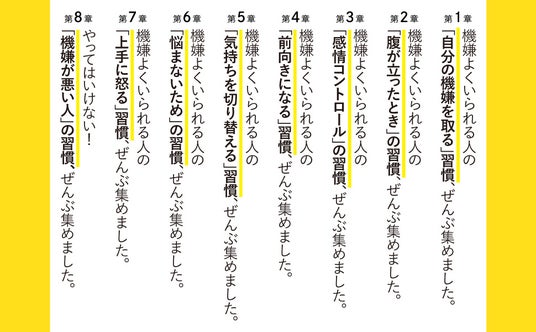 本書では、いつも「機嫌がいい人」の習慣を、日常生活、行動心理、メンタル、思考法など、さまざまな側面から紹介する。