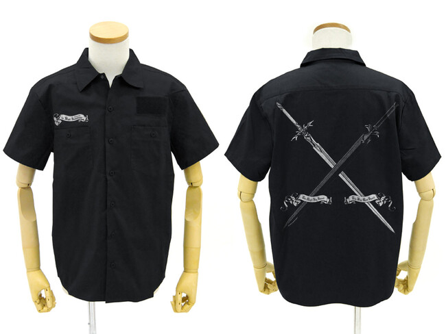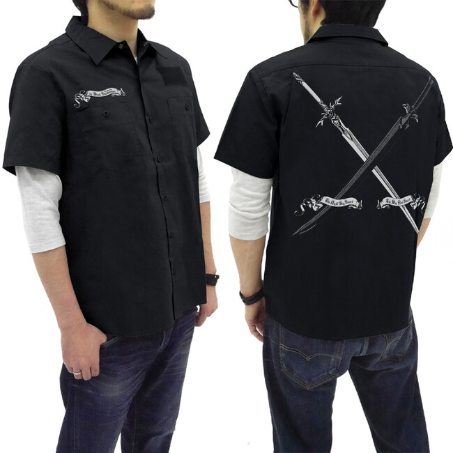 キリトの『夜空の剣』とユージオの『青薔薇の剣』がアンティーク調にデザインされた、頑丈でしっかりとした作りの本格的なワークシャツ。