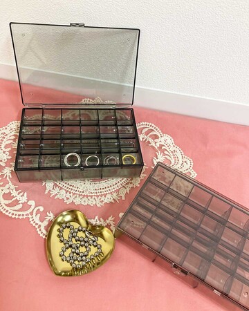 散らばりがちなピアスやリング等の小さなアクセサリーを1つずつ収納できる便利なケースです。ついつい買ってしまい増えていくアクセサリーも、24個の収納でスッキリ片づけられます。