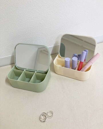 丸みを帯びたフォルムとくすみカラーのデザインが韓国っぽくておしゃれな収納ボックスは便利なミラー付です。仕切りは丸型タイプに3枚、スクエアタイプには6枚あり、アクセサリー収納やコスメ収納にもピッタリのサイズ感です。フタの裏側にミラーが付いておりボックスのくぼみに立て掛けられるため、アクセサリーを付ける際やリップ等の仕上げメイクの際にも便利です。